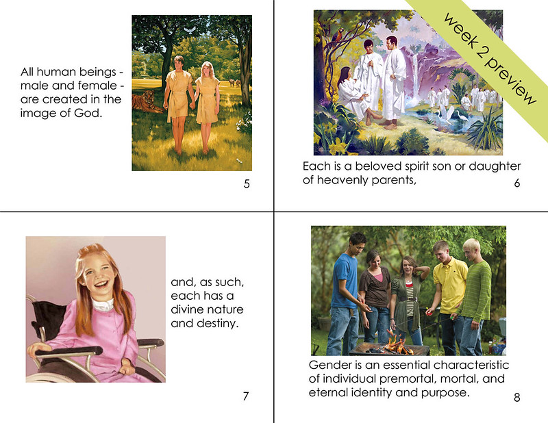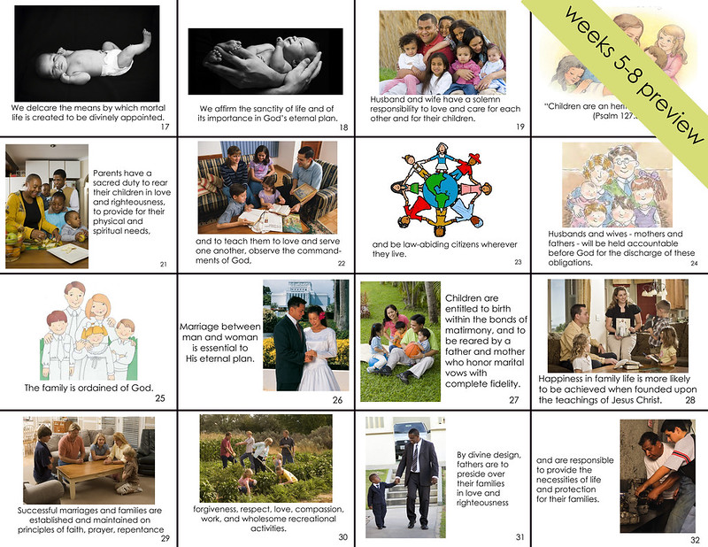 I have divided up the Proclamation into twelve weeks (actually eleven with the last week for review). Each weekly file contains four posters (8.5 x 11 inches) and a page that has four cards. Each card and poster has the lines to memorize for that week along with a picture for a visual cue.